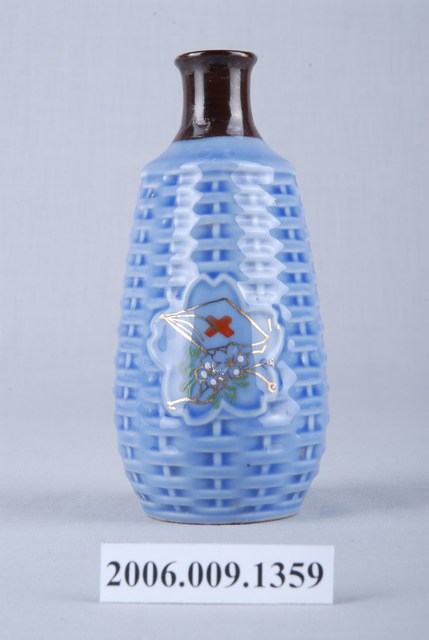 1.藍釉梅紋窄口長酒瓶小圓口,束頸,斜肩方折,腹壁直,略往底部擴張,再收至器底,矮圈足。全器滿釉,口、頸部施深褐色釉,器身施淡藍色釉,瓶身紋路細緻,呈竹片編織貌。器腹上段繪一垂下的梅花枝條,上方掛一旗幟,書「支那事變凱旋記念陸軍衛生部」。器腹另一側則壓印一梅花,內繪風箏與花朵,風箏內有紅色十字,是衛生部的象徵。全器製作細膩,配色典雅,極具時代紀念價值。2.支那事變為中國抗日戰爭中1937年日本全面侵華的事件,為了規避『戰爭』之詞彙,由日本內閣近衛文麻呂命名。本器應為事件過後,日軍大量製造的勞軍產品,造型雖近似酒器,實質應作為展示用器較多。
