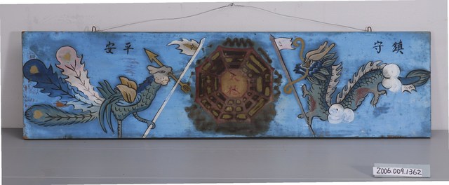八卦牌為民宅最常見的辟邪物,牌面上除了主體的八卦卦象之外,多有增加其他圖案以增強法力之作法,八卦加上龍鳳,即成為龍鳳護八卦之形式,為少見的辟邪裝飾。