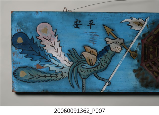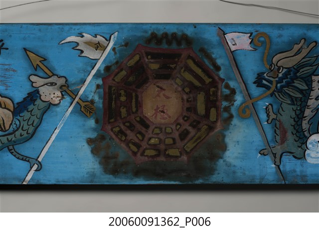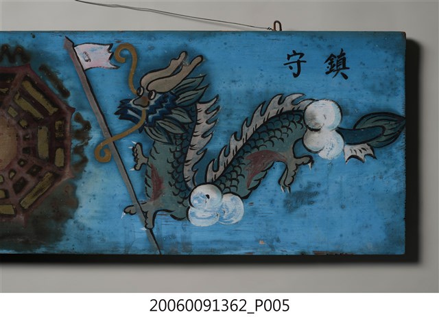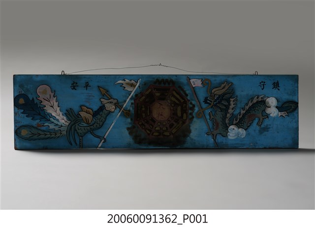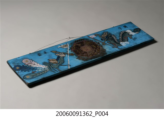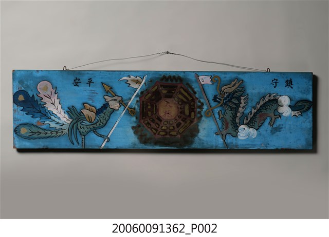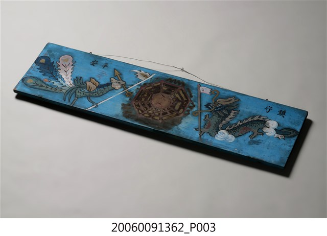 本件龍鳳八卦牌以彩繪方式製作,牌面為長方形,高、寬之比為一比四,有褪色暈染污漬情形。中央繪一方八卦,底色為紅色,卦象為金色,中間書紅色「太極」二字,其八邊之外繪黑色洛書圖案。八卦右邊一條行龍,龍身為藍色,角及背鰭為白色,頭部朝向八卦,左前腳握一根方旗,其面書「日」,上方墨書「鎮守」二字。八卦左邊一隻鳳鳥,身體為藍色,臉為白色,翅膀為金色,尾巴三道作粉、藍、綠等色,頭部朝向八卦,嘴啣一隻箭,左腳抓一根三角旗,旗面書「令」,上方墨書「平安」。