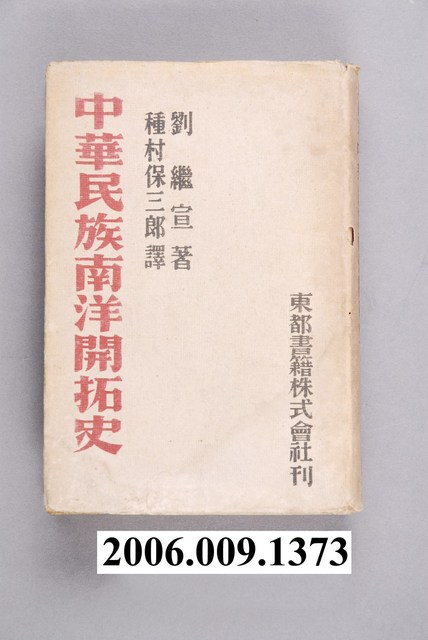 本物件為以中華民族南洋開拓史為主題之書籍,封面有泛黃痕跡,右下角黑字標示東都書籍株式會社刊,左方黑字劉繼宣著、種村保三郎譯,左側紅字中華民族南洋開拓史,書背處黑色字體有劉繼宣、中華民族南洋開拓史、種村保三郎譯,封底有泛黃痕跡,左下方有1圓形圖樣,內寫有停,旁有¥3.80。本書內容記述有中國隋朝至明朝的南洋地區開拓與經營,葡萄牙、西班牙等西方國家於南洋的殖民,西元1935年南洋華僑的人口、教育、經濟等,並附有各時期的南洋地圖。書籍末頁資訊右上角有昭和十八年六月一日印刷(西元1943年6月1日)、昭和十八年六月五日發行(西元1943年6月5日)、三OOO部、中華民族南洋開拓史、有一圓形圖樣內有停字,下方有三圓八O錢,上方貼有1張有中式房屋圖樣的白紙,並蓋有1個紅色圓形戳印,其圖樣或字樣無法辨識;下方由右至左たねむらやすさふるろ、譯者種村保三郎、發行者持田辰郎、印刷者平川政雄。末頁處以黑色筆寫有昭和拾八年八月二八日、買入於美文堂、台南高砂町嚴。
