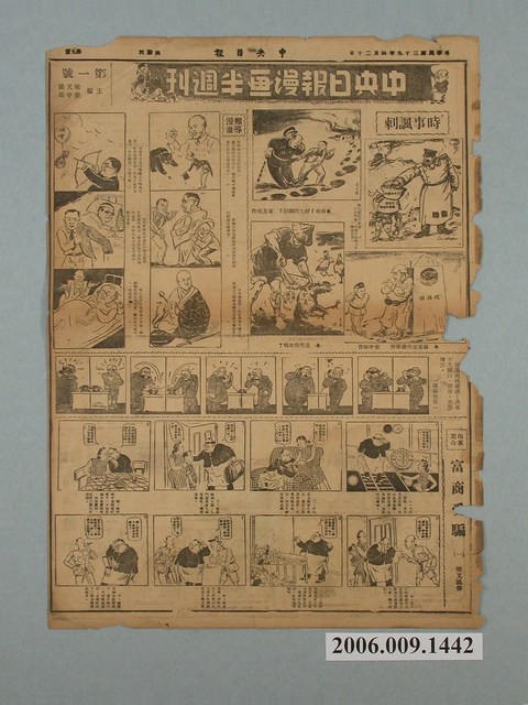 此物件為《中央日報》的專欄之一《漫畫半週刊》,為1950年承繼《中央日報》的姊妹報《漫畫時報》所開設的專欄,由梁又銘、梁中銘主編。由於《中央日報》為中國國民黨的黨報,另外梁中銘與梁又銘在中國即是幫國民黨做文宣工作,所以報紙上的漫畫大多為「反共抗俄」的作品,以貶低毛澤東、史達林、中國共產黨的作品為主,另有連載作品如梁又銘的〈土包子下江南〉、牛哥李費蒙的〈牛伯伯打游擊〉、梁中銘的〈黃興傳〉等等。 臺灣漫畫發展主要始於1940年代日治末期,當時臺灣一群對漫畫有著興趣的青年聚集在一起且都參加過日本的漫畫函授學校,這些青年後自稱為「新高漫畫集團」,而其中最重要的成員為葉宏甲,他以「諸葛四郎」的創作者而成名,此為臺灣漫畫之濫觴,後這批「新高漫畫集團」的作者,在戰後於《新新》雜誌上發表漫畫。在二二八事件後《新新》雜誌被迫停刊,此時期的漫畫也由從中國來臺的移民主導,並以「反共抗俄」的政治宣傳漫畫為主,《中央日報》的漫畫專欄即是如此。在1950年代中後期到1960年代初,雖臺灣盜版漫畫極多,但漫畫的創作也是數量可觀,直到1966年正式實施《編印連環圖畫輔導辦法》,使臺灣漫畫受到大量審查,這樣的政策使日本盜版漫畫更加猖獗,並促使臺灣本土漫畫受到嚴重打擊,直到1990年代才逐漸復原。