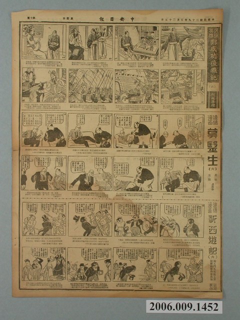 此物件為《中央日報》的專欄之一《漫畫半週刊》,為1950年承繼《中央日報》的姊妹報《漫畫時報》所開設的專欄,由梁又銘、梁中銘主編。由於《中央日報》為中國國民黨的黨報,另外梁中銘與梁又銘在中國即是幫國民黨做文宣工作,所以報紙上的漫畫大多為「反共抗俄」的作品,以貶低毛澤東、史達林、中國共產黨的作品為主,另有連載作品如梁又銘的〈土包子下江南〉、牛哥李費蒙的〈牛伯伯打游擊〉、梁中銘的〈黃興傳〉等等。 臺灣漫畫發展主要始於1940年代日治末期,當時臺灣一群對漫畫有著興趣的青年聚集在一起且都參加過日本的漫畫函授學校,這些青年後自稱為「新高漫畫集團」,而其中最重要的成員為葉宏甲,他以「諸葛四郎」的創作者而成名,此為臺灣漫畫之濫觴,後這批「新高漫畫集團」的作者,在戰後於《新新》雜誌上發表漫畫。在二二八事件後《新新》雜誌被迫停刊,此時期的漫畫也由從中國來臺的移民主導,並以「反共抗俄」的政治宣傳漫畫為主,《中央日報》的漫畫專欄即是如此。在1950年代中後期到1960年代初,雖臺灣盜版漫畫極多,但漫畫的創作也是數量可觀,直到1966年正式實施《編印連環圖畫輔導辦法》,使臺灣漫畫受到大量審查,這樣的政策使日本盜版漫畫更加猖獗,並促使臺灣本土漫畫受到嚴重打擊,直到1990年代才逐漸復原。