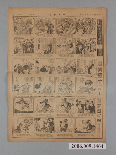 此物件為《中央日報》的專欄之一《漫畫半週刊》,為1950年承繼《中央日報》的姊妹報《漫畫時報》所開設的專欄,由梁又銘、梁中銘主編。由於《中央日報》為中國國民黨的黨報,另外梁中銘與梁又銘在中國即是幫國民黨做文宣工作,所以報紙上的漫畫大多為「反共抗俄」的作品,以貶低毛澤東、史達林、中國共產黨的作品為主,另有連載作品如梁又銘的〈土包子下江南〉、牛哥李費蒙的〈牛伯伯打游擊〉、梁中銘的〈黃興傳〉等等。 臺灣漫畫發展主要始於1940年代日治末期,當時臺灣一群對漫畫有著興趣的青年聚集在一起且都參加過日本的漫畫函授學校,這些青年後自稱為「新高漫畫集團」,而其中最重要的成員為葉宏甲,他以「諸葛四郎」的創作者而成名,此為臺灣漫畫之濫觴,後這批「新高漫畫集團」的作者,在戰後於《新新》雜誌上發表漫畫。在二二八事件後《新新》雜誌被迫停刊,此時期的漫畫也由從中國來臺的移民主導,並以「反共抗俄」的政治宣傳漫畫為主,《中央日報》的漫畫專欄即是如此。在1950年代中後期到1960年代初,雖臺灣盜版漫畫極多,但漫畫的創作也是數量可觀,直到1966年正式實施《編印連環圖畫輔導辦法》,使臺灣漫畫受到大量審查,這樣的政策使日本盜版漫畫更加猖獗,並促使臺灣本土漫畫受到嚴重打擊,直到1990年代才逐漸復原。