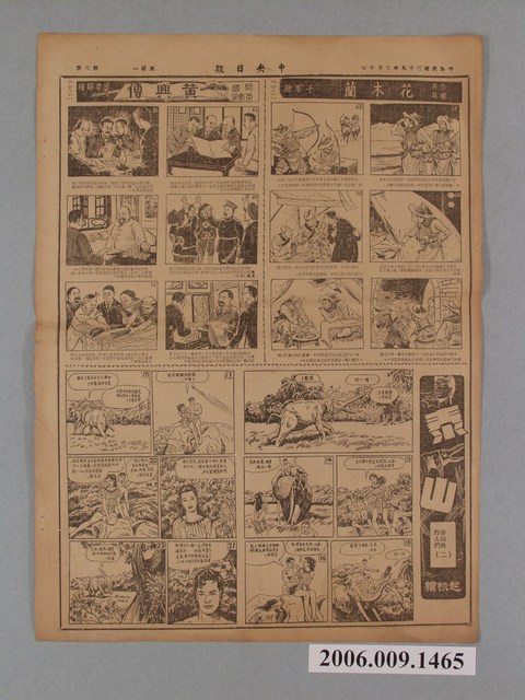 此物件為《中央日報》的專欄之一《漫畫半週刊》,為1950年承繼《中央日報》的姊妹報《漫畫時報》所開設的專欄,由梁又銘、梁中銘主編。由於《中央日報》為中國國民黨的黨報,另外梁中銘與梁又銘在中國即是幫國民黨做文宣工作,所以報紙上的漫畫大多為「反共抗俄」的作品,以貶低毛澤東、史達林、中國共產黨的作品為主,另有連載作品如梁又銘的〈土包子下江南〉、牛哥李費蒙的〈牛伯伯打游擊〉、梁中銘的〈黃興傳〉等等。 臺灣漫畫發展主要始於1940年代日治末期,當時臺灣一群對漫畫有著興趣的青年聚集在一起且都參加過日本的漫畫函授學校,這些青年後自稱為「新高漫畫集團」,而其中最重要的成員為葉宏甲,他以「諸葛四郎」的創作者而成名,此為臺灣漫畫之濫觴,後這批「新高漫畫集團」的作者,在戰後於《新新》雜誌上發表漫畫。在二二八事件後《新新》雜誌被迫停刊,此時期的漫畫也由從中國來臺的移民主導,並以「反共抗俄」的政治宣傳漫畫為主,《中央日報》的漫畫專欄即是如此。在1950年代中後期到1960年代初,雖臺灣盜版漫畫極多,但漫畫的創作也是數量可觀,直到1966年正式實施《編印連環圖畫輔導辦法》,使臺灣漫畫受到大量審查,這樣的政策使日本盜版漫畫更加猖獗,並促使臺灣本土漫畫受到嚴重打擊,直到1990年代才逐漸復原。
