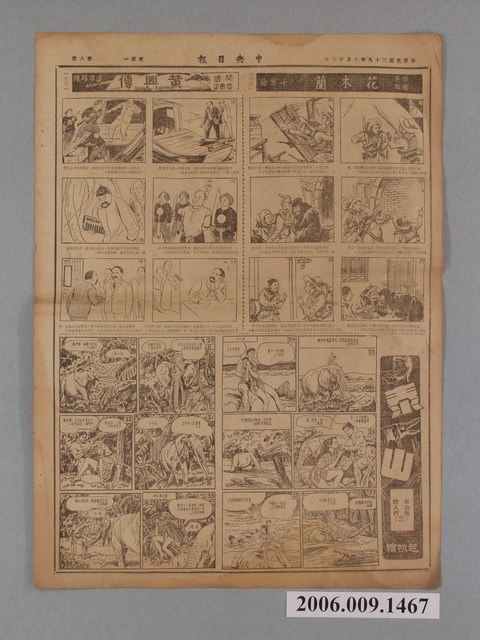 此物件為《中央日報》的專欄之一《漫畫半週刊》,為1950年承繼《中央日報》的姊妹報《漫畫時報》所開設的專欄,由梁又銘、梁中銘主編。由於《中央日報》為中國國民黨的黨報,另外梁中銘與梁又銘在中國即是幫國民黨做文宣工作,所以報紙上的漫畫大多為「反共抗俄」的作品,以貶低毛澤東、史達林、中國共產黨的作品為主,另有連載作品如梁又銘的〈土包子下江南〉、牛哥李費蒙的〈牛伯伯打游擊〉、梁中銘的〈黃興傳〉等等。 臺灣漫畫發展主要始於1940年代日治末期,當時臺灣一群對漫畫有著興趣的青年聚集在一起且都參加過日本的漫畫函授學校,這些青年後自稱為「新高漫畫集團」,而其中最重要的成員為葉宏甲,他以「諸葛四郎」的創作者而成名,此為臺灣漫畫之濫觴,後這批「新高漫畫集團」的作者,在戰後於《新新》雜誌上發表漫畫。在二二八事件後《新新》雜誌被迫停刊,此時期的漫畫也由從中國來臺的移民主導,並以「反共抗俄」的政治宣傳漫畫為主,《中央日報》的漫畫專欄即是如此。在1950年代中後期到1960年代初,雖臺灣盜版漫畫極多,但漫畫的創作也是數量可觀,直到1966年正式實施《編印連環圖畫輔導辦法》,使臺灣漫畫受到大量審查,這樣的政策使日本盜版漫畫更加猖獗,並促使臺灣本土漫畫受到嚴重打擊,直到1990年代才逐漸復原。
