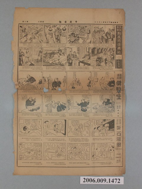 此物件為《中央日報》的專欄之一《漫畫半週刊》,為1950年承繼《中央日報》的姊妹報《漫畫時報》所開設的專欄,由梁又銘、梁中銘主編。由於《中央日報》為中國國民黨的黨報,另外梁中銘與梁又銘在中國即是幫國民黨做文宣工作,所以報紙上的漫畫大多為「反共抗俄」的作品,以貶低毛澤東、史達林、中國共產黨的作品為主,另有連載作品如梁又銘的〈土包子下江南〉、牛哥李費蒙的〈牛伯伯打游擊〉、梁中銘的〈黃興傳〉等等。 臺灣漫畫發展主要始於1940年代日治末期,當時臺灣一群對漫畫有著興趣的青年聚集在一起且都參加過日本的漫畫函授學校,這些青年後自稱為「新高漫畫集團」,而其中最重要的成員為葉宏甲,他以「諸葛四郎」的創作者而成名,此為臺灣漫畫之濫觴,後這批「新高漫畫集團」的作者,在戰後於《新新》雜誌上發表漫畫。在二二八事件後《新新》雜誌被迫停刊,此時期的漫畫也由從中國來臺的移民主導,並以「反共抗俄」的政治宣傳漫畫為主,《中央日報》的漫畫專欄即是如此。在1950年代中後期到1960年代初,雖臺灣盜版漫畫極多,但漫畫的創作也是數量可觀,直到1966年正式實施《編印連環圖畫輔導辦法》,使臺灣漫畫受到大量審查,這樣的政策使日本盜版漫畫更加猖獗,並促使臺灣本土漫畫受到嚴重打擊,直到1990年代才逐漸復原。