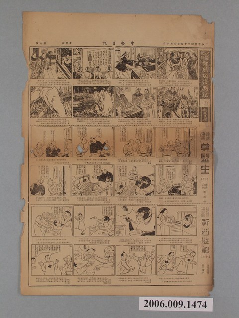 此物件為《中央日報》的專欄之一《漫畫半週刊》,為1950年承繼《中央日報》的姊妹報《漫畫時報》所開設的專欄,由梁又銘、梁中銘主編。由於《中央日報》為中國國民黨的黨報,另外梁中銘與梁又銘在中國即是幫國民黨做文宣工作,所以報紙上的漫畫大多為「反共抗俄」的作品,以貶低毛澤東、史達林、中國共產黨的作品為主,另有連載作品如梁又銘的〈土包子下江南〉、牛哥李費蒙的〈牛伯伯打游擊〉、梁中銘的〈黃興傳〉等等。 臺灣漫畫發展主要始於1940年代日治末期,當時臺灣一群對漫畫有著興趣的青年聚集在一起且都參加過日本的漫畫函授學校,這些青年後自稱為「新高漫畫集團」,而其中最重要的成員為葉宏甲,他以「諸葛四郎」的創作者而成名,此為臺灣漫畫之濫觴,後這批「新高漫畫集團」的作者,在戰後於《新新》雜誌上發表漫畫。在二二八事件後《新新》雜誌被迫停刊,此時期的漫畫也由從中國來臺的移民主導,並以「反共抗俄」的政治宣傳漫畫為主,《中央日報》的漫畫專欄即是如此。在1950年代中後期到1960年代初,雖臺灣盜版漫畫極多,但漫畫的創作也是數量可觀,直到1966年正式實施《編印連環圖畫輔導辦法》,使臺灣漫畫受到大量審查,這樣的政策使日本盜版漫畫更加猖獗,並促使臺灣本土漫畫受到嚴重打擊,直到1990年代才逐漸復原。