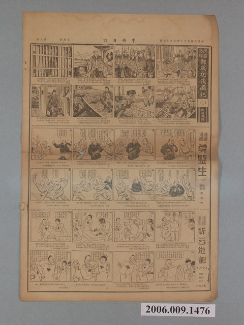 此物件為《中央日報》的專欄之一《漫畫半週刊》,為1950年承繼《中央日報》的姊妹報《漫畫時報》所開設的專欄,由梁又銘、梁中銘主編。由於《中央日報》為中國國民黨的黨報,另外梁中銘與梁又銘在中國即是幫國民黨做文宣工作,所以報紙上的漫畫大多為「反共抗俄」的作品,以貶低毛澤東、史達林、中國共產黨的作品為主,另有連載作品如梁又銘的〈土包子下江南〉、牛哥李費蒙的〈牛伯伯打游擊〉、梁中銘的〈黃興傳〉等等。 臺灣漫畫發展主要始於1940年代日治末期,當時臺灣一群對漫畫有著興趣的青年聚集在一起且都參加過日本的漫畫函授學校,這些青年後自稱為「新高漫畫集團」,而其中最重要的成員為葉宏甲,他以「諸葛四郎」的創作者而成名,此為臺灣漫畫之濫觴,後這批「新高漫畫集團」的作者,在戰後於《新新》雜誌上發表漫畫。在二二八事件後《新新》雜誌被迫停刊,此時期的漫畫也由從中國來臺的移民主導,並以「反共抗俄」的政治宣傳漫畫為主,《中央日報》的漫畫專欄即是如此。在1950年代中後期到1960年代初,雖臺灣盜版漫畫極多,但漫畫的創作也是數量可觀,直到1966年正式實施《編印連環圖畫輔導辦法》,使臺灣漫畫受到大量審查,這樣的政策使日本盜版漫畫更加猖獗,並促使臺灣本土漫畫受到嚴重打擊,直到1990年代才逐漸復原。