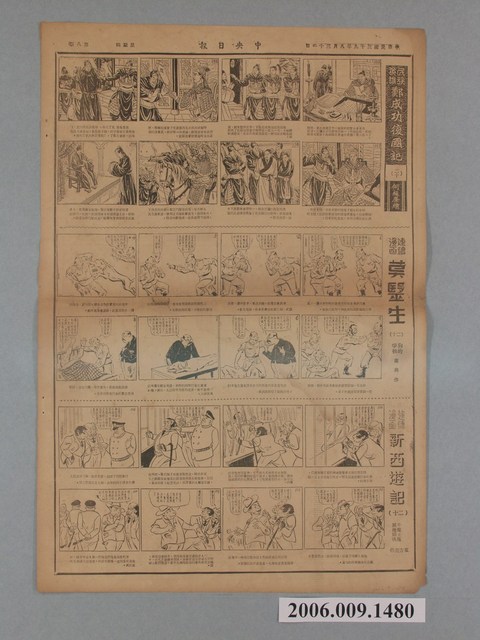 此物件為《中央日報》的專欄之一《漫畫半週刊》,為1950年承繼《中央日報》的姊妹報《漫畫時報》所開設的專欄,由梁又銘、梁中銘主編。由於《中央日報》為中國國民黨的黨報,另外梁中銘與梁又銘在中國即是幫國民黨做文宣工作,所以報紙上的漫畫大多為「反共抗俄」的作品,以貶低毛澤東、史達林、中國共產黨的作品為主,另有連載作品如梁又銘的〈土包子下江南〉、牛哥李費蒙的〈牛伯伯打游擊〉、梁中銘的〈黃興傳〉等等。 臺灣漫畫發展主要始於1940年代日治末期,當時臺灣一群對漫畫有著興趣的青年聚集在一起且都參加過日本的漫畫函授學校,這些青年後自稱為「新高漫畫集團」,而其中最重要的成員為葉宏甲,他以「諸葛四郎」的創作者而成名,此為臺灣漫畫之濫觴,後這批「新高漫畫集團」的作者,在戰後於《新新》雜誌上發表漫畫。在二二八事件後《新新》雜誌被迫停刊,此時期的漫畫也由從中國來臺的移民主導,並以「反共抗俄」的政治宣傳漫畫為主,《中央日報》的漫畫專欄即是如此。在1950年代中後期到1960年代初,雖臺灣盜版漫畫極多,但漫畫的創作也是數量可觀,直到1966年正式實施《編印連環圖畫輔導辦法》,使臺灣漫畫受到大量審查,這樣的政策使日本盜版漫畫更加猖獗,並促使臺灣本土漫畫受到嚴重打擊,直到1990年代才逐漸復原。