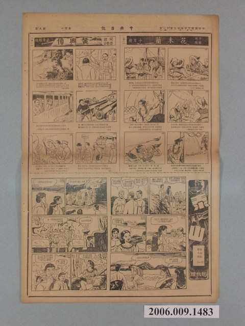 此物件為《中央日報》的專欄之一《漫畫半週刊》,為1950年承繼《中央日報》的姊妹報《漫畫時報》所開設的專欄,由梁又銘、梁中銘主編。由於《中央日報》為中國國民黨的黨報,另外梁中銘與梁又銘在中國即是幫國民黨做文宣工作,所以報紙上的漫畫大多為「反共抗俄」的作品,以貶低毛澤東、史達林、中國共產黨的作品為主,另有連載作品如梁又銘的〈土包子下江南〉、牛哥李費蒙的〈牛伯伯打游擊〉、梁中銘的〈黃興傳〉等等。 臺灣漫畫發展主要始於1940年代日治末期,當時臺灣一群對漫畫有著興趣的青年聚集在一起且都參加過日本的漫畫函授學校,這些青年後自稱為「新高漫畫集團」,而其中最重要的成員為葉宏甲,他以「諸葛四郎」的創作者而成名,此為臺灣漫畫之濫觴,後這批「新高漫畫集團」的作者,在戰後於《新新》雜誌上發表漫畫。在二二八事件後《新新》雜誌被迫停刊,此時期的漫畫也由從中國來臺的移民主導,並以「反共抗俄」的政治宣傳漫畫為主,《中央日報》的漫畫專欄即是如此。在1950年代中後期到1960年代初,雖臺灣盜版漫畫極多,但漫畫的創作也是數量可觀,直到1966年正式實施《編印連環圖畫輔導辦法》,使臺灣漫畫受到大量審查,這樣的政策使日本盜版漫畫更加猖獗,並促使臺灣本土漫畫受到嚴重打擊,直到1990年代才逐漸復原。