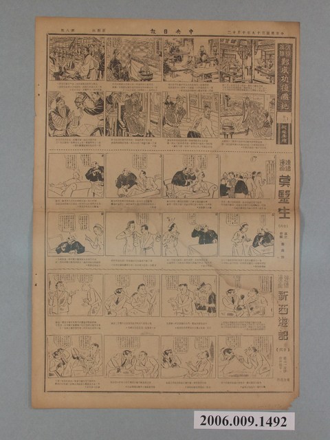 此物件為《中央日報》的專欄之一《漫畫半週刊》,為1950年承繼《中央日報》的姊妹報《漫畫時報》所開設的專欄,由梁又銘、梁中銘主編。由於《中央日報》為中國國民黨的黨報,另外梁中銘與梁又銘在中國即是幫國民黨做文宣工作,所以報紙上的漫畫大多為「反共抗俄」的作品,以貶低毛澤東、史達林、中國共產黨的作品為主,另有連載作品如梁又銘的〈土包子下江南〉、牛哥李費蒙的〈牛伯伯打游擊〉、梁中銘的〈黃興傳〉等等。 臺灣漫畫發展主要始於1940年代日治末期,當時臺灣一群對漫畫有著興趣的青年聚集在一起且都參加過日本的漫畫函授學校,這些青年後自稱為「新高漫畫集團」,而其中最重要的成員為葉宏甲,他以「諸葛四郎」的創作者而成名,此為臺灣漫畫之濫觴,後這批「新高漫畫集團」的作者,在戰後於《新新》雜誌上發表漫畫。在二二八事件後《新新》雜誌被迫停刊,此時期的漫畫也由從中國來臺的移民主導,並以「反共抗俄」的政治宣傳漫畫為主,《中央日報》的漫畫專欄即是如此。在1950年代中後期到1960年代初,雖臺灣盜版漫畫極多,但漫畫的創作也是數量可觀,直到1966年正式實施《編印連環圖畫輔導辦法》,使臺灣漫畫受到大量審查,這樣的政策使日本盜版漫畫更加猖獗,並促使臺灣本土漫畫受到嚴重打擊,直到1990年代才逐漸復原。