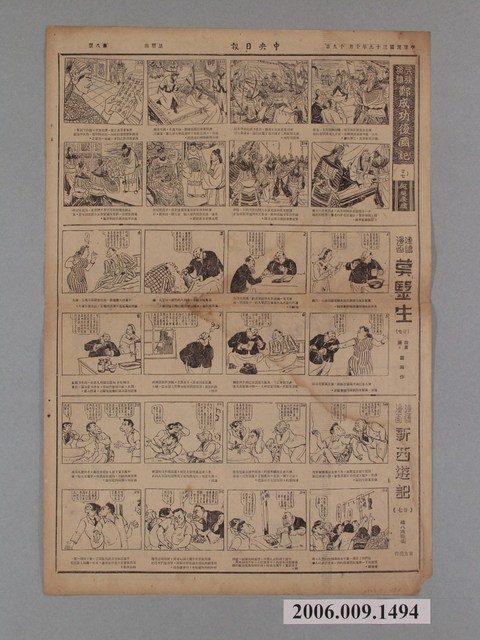 此物件為《中央日報》的專欄之一《漫畫半週刊》,為1950年承繼《中央日報》的姊妹報《漫畫時報》所開設的專欄,由梁又銘、梁中銘主編。由於《中央日報》為中國國民黨的黨報,另外梁中銘與梁又銘在中國即是幫國民黨做文宣工作,所以報紙上的漫畫大多為「反共抗俄」的作品,以貶低毛澤東、史達林、中國共產黨的作品為主,另有連載作品如梁又銘的〈土包子下江南〉、牛哥李費蒙的〈牛伯伯打游擊〉、梁中銘的〈黃興傳〉等等。 臺灣漫畫發展主要始於1940年代日治末期,當時臺灣一群對漫畫有著興趣的青年聚集在一起且都參加過日本的漫畫函授學校,這些青年後自稱為「新高漫畫集團」,而其中最重要的成員為葉宏甲,他以「諸葛四郎」的創作者而成名,此為臺灣漫畫之濫觴,後這批「新高漫畫集團」的作者,在戰後於《新新》雜誌上發表漫畫。在二二八事件後《新新》雜誌被迫停刊,此時期的漫畫也由從中國來臺的移民主導,並以「反共抗俄」的政治宣傳漫畫為主,《中央日報》的漫畫專欄即是如此。在1950年代中後期到1960年代初,雖臺灣盜版漫畫極多,但漫畫的創作也是數量可觀,直到1966年正式實施《編印連環圖畫輔導辦法》,使臺灣漫畫受到大量審查,這樣的政策使日本盜版漫畫更加猖獗,並促使臺灣本土漫畫受到嚴重打擊,直到1990年代才逐漸復原。