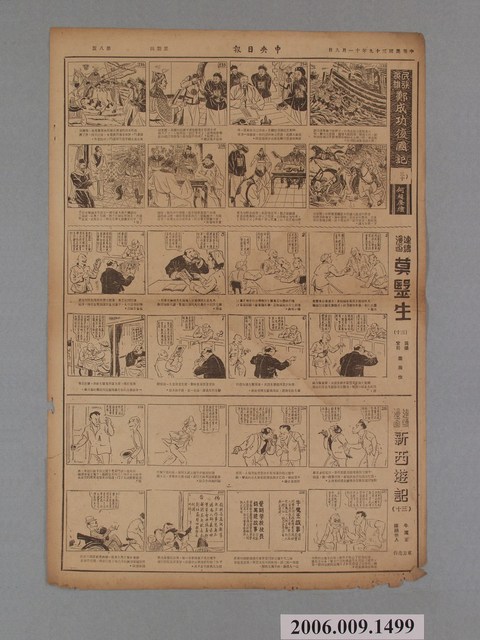 此物件為《中央日報》的專欄之一《漫畫半週刊》,為1950年承繼《中央日報》的姊妹報《漫畫時報》所開設的專欄,由梁又銘、梁中銘主編。由於《中央日報》為中國國民黨的黨報,另外梁中銘與梁又銘在中國即是幫國民黨做文宣工作,所以報紙上的漫畫大多為「反共抗俄」的作品,以貶低毛澤東、史達林、中國共產黨的作品為主,另有連載作品如梁又銘的〈土包子下江南〉、牛哥李費蒙的〈牛伯伯打游擊〉、梁中銘的〈黃興傳〉等等。 臺灣漫畫發展主要始於1940年代日治末期,當時臺灣一群對漫畫有著興趣的青年聚集在一起且都參加過日本的漫畫函授學校,這些青年後自稱為「新高漫畫集團」,而其中最重要的成員為葉宏甲,他以「諸葛四郎」的創作者而成名,此為臺灣漫畫之濫觴,後這批「新高漫畫集團」的作者,在戰後於《新新》雜誌上發表漫畫。在二二八事件後《新新》雜誌被迫停刊,此時期的漫畫也由從中國來臺的移民主導,並以「反共抗俄」的政治宣傳漫畫為主,《中央日報》的漫畫專欄即是如此。在1950年代中後期到1960年代初,雖臺灣盜版漫畫極多,但漫畫的創作也是數量可觀,直到1966年正式實施《編印連環圖畫輔導辦法》,使臺灣漫畫受到大量審查,這樣的政策使日本盜版漫畫更加猖獗,並促使臺灣本土漫畫受到嚴重打擊,直到1990年代才逐漸復原。
