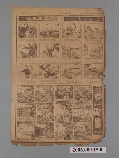此物件為《中央日報》的專欄之一《漫畫半週刊》,為1950年承繼《中央日報》的姊妹報《漫畫時報》所開設的專欄,由梁又銘、梁中銘主編。由於《中央日報》為中國國民黨的黨報,另外梁中銘與梁又銘在中國即是幫國民黨做文宣工作,所以報紙上的漫畫大多為「反共抗俄」的作品,以貶低毛澤東、史達林、中國共產黨的作品為主,另有連載作品如梁又銘的〈土包子下江南〉、牛哥李費蒙的〈牛伯伯打游擊〉、梁中銘的〈黃興傳〉等等。 臺灣漫畫發展主要始於1940年代日治末期,當時臺灣一群對漫畫有著興趣的青年聚集在一起且都參加過日本的漫畫函授學校,這些青年後自稱為「新高漫畫集團」,而其中最重要的成員為葉宏甲,他以「諸葛四郎」的創作者而成名,此為臺灣漫畫之濫觴,後這批「新高漫畫集團」的作者,在戰後於《新新》雜誌上發表漫畫。在二二八事件後《新新》雜誌被迫停刊,此時期的漫畫也由從中國來臺的移民主導,並以「反共抗俄」的政治宣傳漫畫為主,《中央日報》的漫畫專欄即是如此。在1950年代中後期到1960年代初,雖臺灣盜版漫畫極多,但漫畫的創作也是數量可觀,直到1966年正式實施《編印連環圖畫輔導辦法》,使臺灣漫畫受到大量審查,這樣的政策使日本盜版漫畫更加猖獗,並促使臺灣本土漫畫受到嚴重打擊,直到1990年代才逐漸復原。