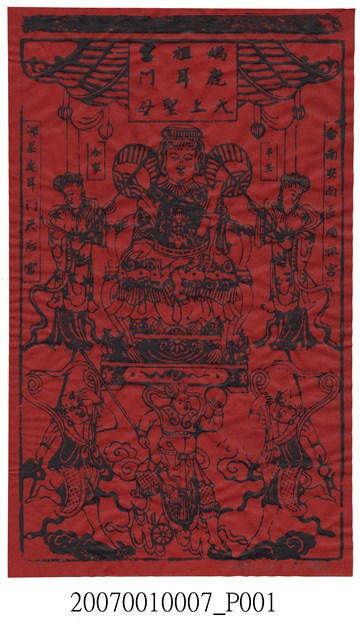 本件鹿耳門媽祖宮天上聖母神禡,以單一墨色印製於紅色紙張上。畫面以粗線為外框,框內上方作傳統寺廟屋頂下簷,正中方框內橫書「媽祖宮」、「鹿耳門」、「天上聖母」,鹿耳門媽祖宮座落於臺南市安南區。畫面中央端坐天上聖母像,媽祖頭戴冕冠,身穿蟒袍,左手持朝笏,右手置於右膝上,身後左右立一對持搖扇之侍女,頭部左右直書「平安」、「合家」,侍女外側直框內各一行文字「台南安南區媽祖宮」、「開基鹿耳門天后宮」。媽祖座下中央為中壇元帥,腳踏風火輪,雙手分持火尖槍、乾坤圈,兩旁立跣足的千里眼、順風耳二將軍,千里眼將軍居右方,右手上舉作觀看狀,左手倒持一把槍,順風耳居左方,左手指左耳作聽音狀,右手倒持一把鉞。