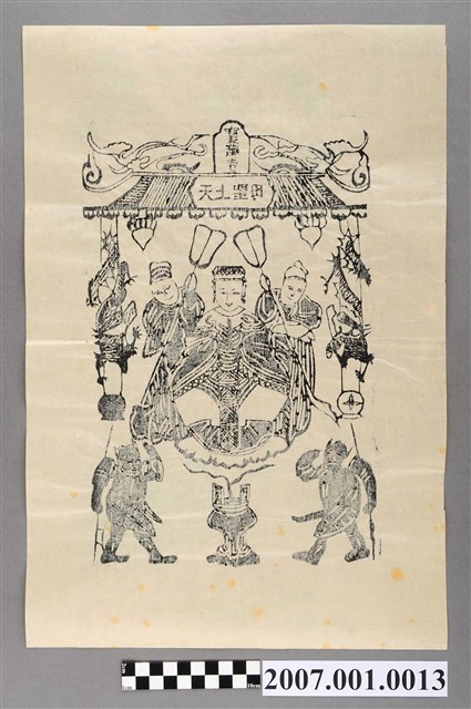 本件寶藏寺天上聖母神禡,以單一墨色印製於米黃色紙張上,印版為清代製品,右下角有鉛筆註記印版來源為「彰化芬園寶藏寺三級古蹟」,寶藏寺座落於彰化縣芬園鄉,為清代彰化縣轄內「三巖二寺」之一。畫面中作一座傳統廟宇殿堂,屋頂之屋脊正中直書「寶藏寺」,兩側有如意海浪紋,屋頂橫額內書「天上聖母」,簷下兩側作一對蟠龍柱,殿堂內中央端坐天上聖母像,媽祖頭戴冕冠,身穿蟒袍,雙手當胸持朝笏,身旁兩側立一對持搖扇之侍女。媽祖座下一只薰爐,兩旁立跣足的千里眼、順風耳二將軍,千里眼將軍居右方,右手上舉作觀看狀,左手倒持一把戟,順風耳居左方,左手指左耳作聽音狀,右手倒持一把蛇矛。
