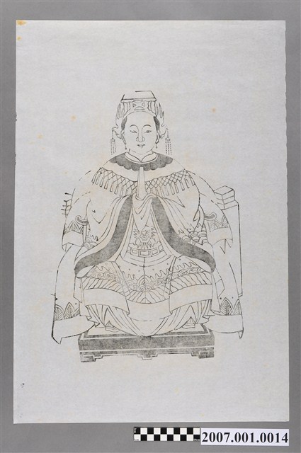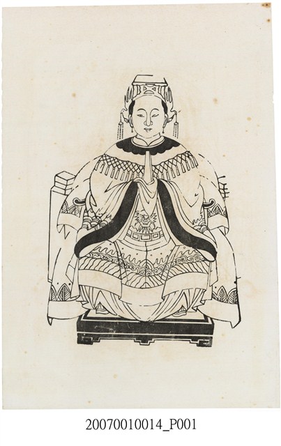 本件天上聖母版印神像,以單一墨色印製於白色紙張上,其印版為清代製品。畫面單獨作一尊媽祖坐像,媽祖正面端坐於椅上,面容娟秀,丹鳳眼、柳葉眉,鼻如垂膽,頭戴冕冠,冠之兩側耳部有鳳鳥啣珠垂飾,身穿蟒袍珠佩雲肩,雙手當胸持朝笏。