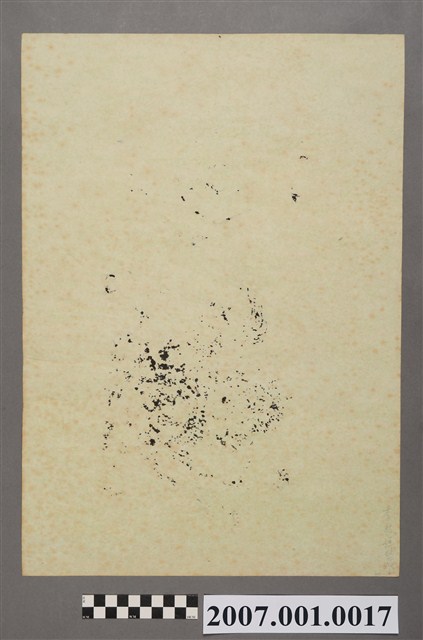 本件中壇元帥版印神禡以墨版印製於淺綠色棉紙上,原版為清代製品,背面右下角鉛筆註記「李躬恒收藏」,為版畫或印版之原收藏家。神禡頂端符頭書勅令,其下一方太極先天八卦,兩側書「合家」、「平安」。下方為中壇元帥之像,元帥跨騎一匹頭部朝左之獅子,頭戴太子冠,身穿鎧甲,身上有飄帶。姿態作趨身向左而頭部轉向右側,右手上舉握一把矛槍,左手下垂持一只乾坤圈,獅子尾部上方有一只薰爐。
