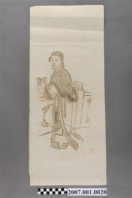 侍女為女性神祇之侍者,一般多為兩人一對以作為女神之挾祀,其造形多作古代丫鬟模樣,雙手持扇或其他寶物,作服侍主神姿態。依版印風格,推測本件與登錄號2007.001.0019應為一對。