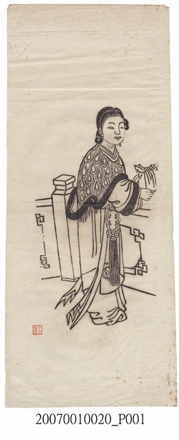 本件侍女像以單一墨色印製於白色棉紙上,右下角鉛筆註記「張木養」,為版畫或印版之原收藏者,左下角一方小型朱印「木養」。侍女作古代立姿仕女造形,額上有瀏海而頭後梳垂髻,面朝右方,身穿長袍披水滴紋長披肩,肘間垂有飄帶,雙手向前平舉,合持一方包裹布巾之印,腰前掛一只如意型佩飾,流蘇垂至腳部,身後有一段欄杆界畫背景裝飾。