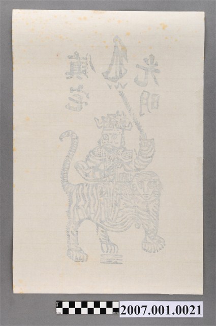 本件版印神禡,以單一墨色印製於米黃色紙張之上,原版為清代製品。畫面上方書勅令、VVV,為符頭,兩側書「鎮宅」、「光明」,其下作一位跨坐虎背之武財神像。神像作古代武將造形,頭戴鐵冠,黑面虯髯,額有三眼,身穿鎧甲,右手上舉持一把多節鐵鞭,左手於腹前結法訣,為金輪如意趙元帥之特徵。跨下黑虎頭部在左而臉部朝前方,四肢直立,尾部上豎,後肢右腳下方書一「罡」字,為符腳。