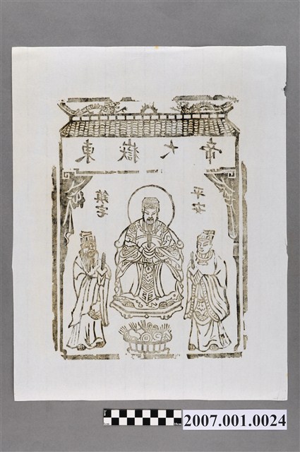 本件東嶽大帝神禡以單一墨色印製於白色紙張上,畫面以粗線為外框,四周之框線有多處缺損,框內作一座具有傳統翹脊式屋頂之殿堂,屋頂正脊作雙龍搶珠裝飾。屋簷下橫框內書「東嶽大帝」,下方為殿堂,左右兩側垂有帳縵。殿堂內中央東嶽大帝端坐於圈椅之上,大帝頭戴冕冠,身穿蟒袍,長髯垂胸,雙手合持一方朝笏當胸,頭部後方有圓形頭光,兩側書「鎮宅」、「平安」。大帝左右兩側立一對穿著寬袖官服的神吏,右邊一位臉蓄長髯,左邊一位白面無鬚,兩神皆雙手合舉朝笏,侍立於大帝左右。大帝座前有一只聚寶盆,內盛錢幣、蕉扇、元寶等物。