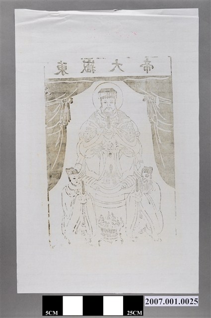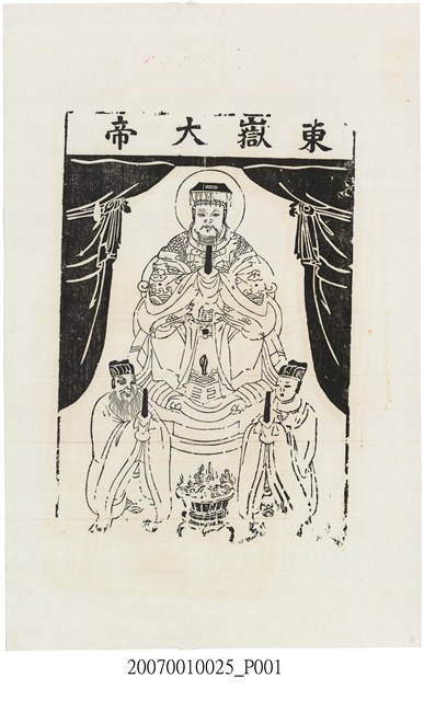 本件東嶽大帝神禡以單一墨色印製於白色紙張上,畫面以黑線為外框上下方之框線已缺損,框內作一殿堂,上方橫框內書「東嶽大帝」,殿堂左右兩側垂有黑色帳縵。殿堂內中央東嶽大帝端坐於圈椅之上,大帝頭戴冕冠,身穿蟒袍,長髯垂胸,雙手合持一方朝笏當胸,頭部後方有圓形頭光。大帝座前左右兩側立一對穿著寬袖官服的神吏,左邊一位臉蓄長髯,右邊一位白面無鬚,兩神皆雙手合舉朝笏,侍立於大帝座前。座前兩神之間有一只聚寶盆,內盛錢幣、蕉扇、元寶等物。