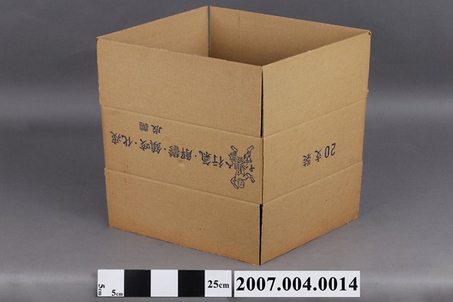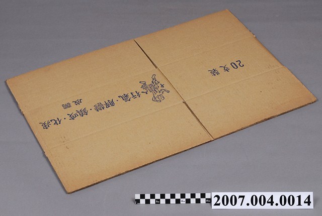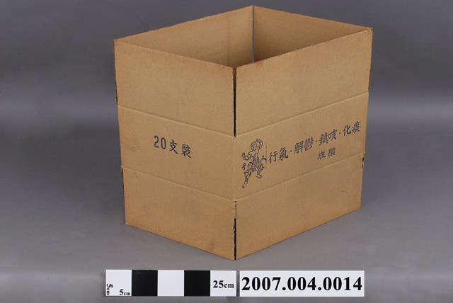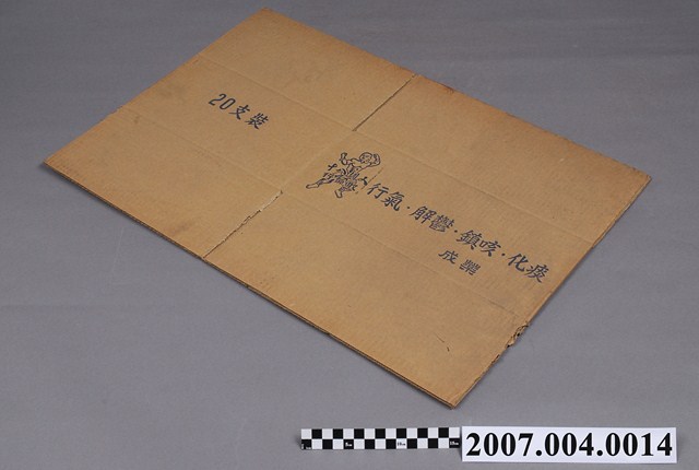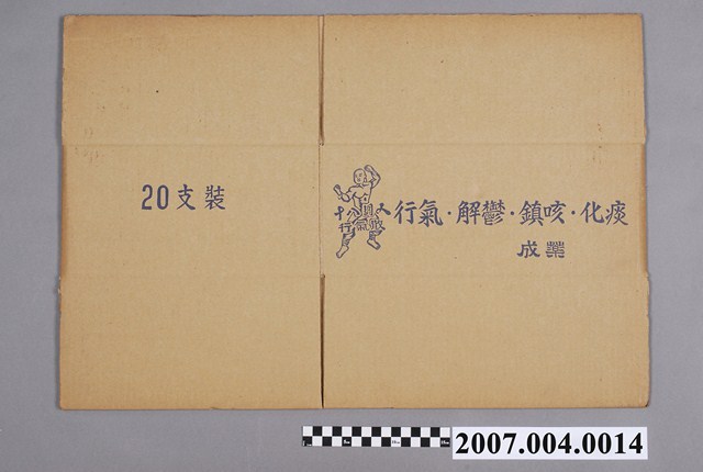 本物件為十八銅人行氣散紙箱。紙箱為牛皮色,有一面印有行氣、解鬱、鎮咳、化痰、成藥和十八銅人行氣散字樣與銅人圖案。另一面印有20支裝字樣。