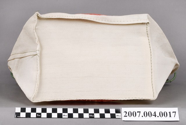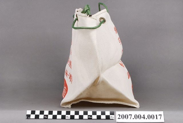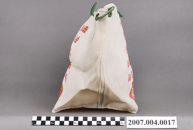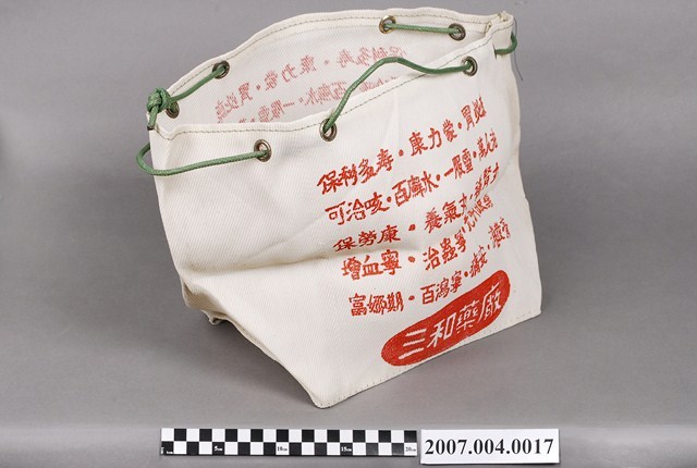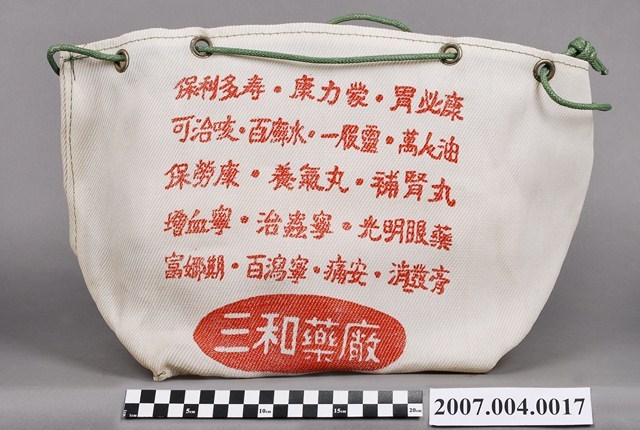 本物件為三和藥廠提袋。提袋底色為白色,字樣為紅色。提繩為綠色。前後兩面印有相同字樣,有保利多壽、康力蒙、胃必康、可洽咳、百癬水、一服靈等17種藥名與三和藥廠字樣。