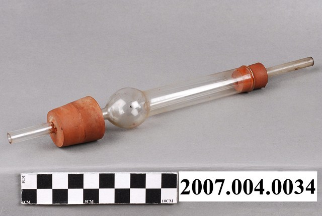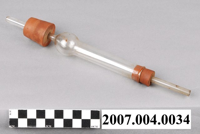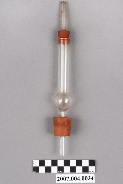 本物件為實驗室玻璃器皿。玻璃器皿為似管狀物,管狀物中間有圓弧型鼓起來之構造。物件整體包含2個似橡膠材質之塞子,中間有孔,可插入管子。