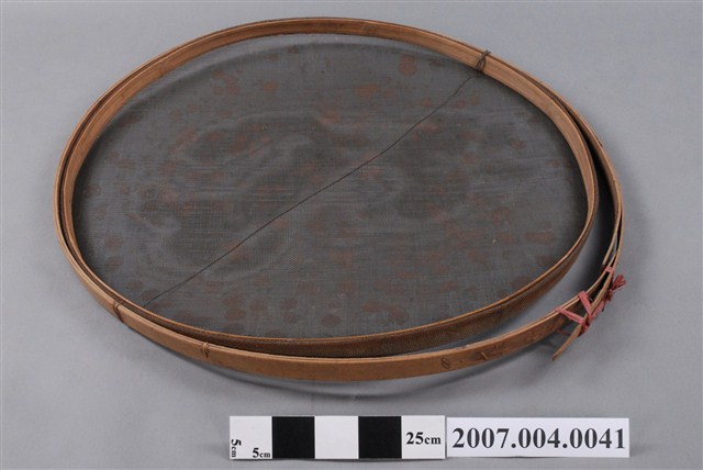 本物件為圓篩子。篩子為圓型,篩面四周有圍面,圍面高度偏窄。原圍面接口穿繩鬆脫,用紅色塑膠繩固定,最外圍的圍面已分離。