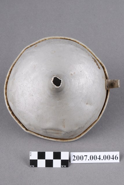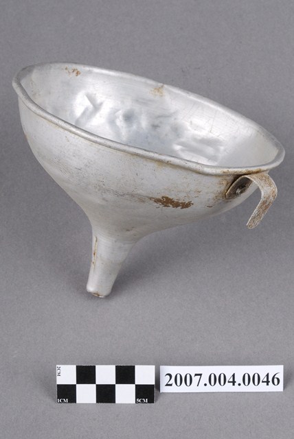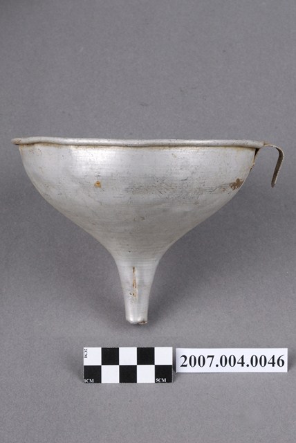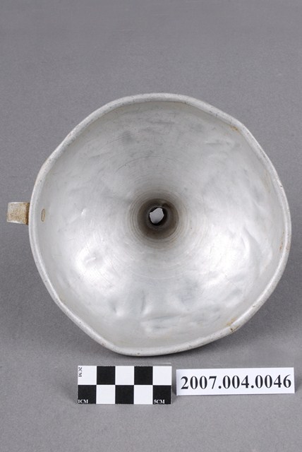 本物件為鋁製漏斗。漏斗為銀白色,漏斗口略有變型。漏斗身有一握把。