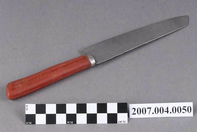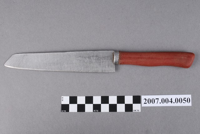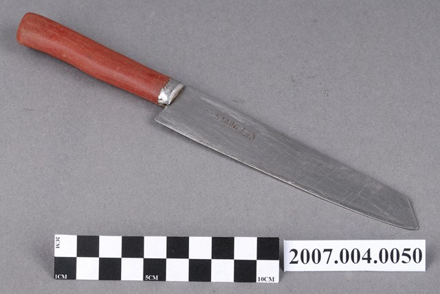 本物件為刀。此刀可分成刀柄和刀身。刀柄為紅色,塑膠材質,上面有使用過的痕跡。刀身為金屬,刀身上刻有STAINLESS字樣。