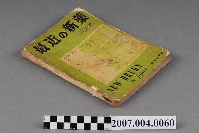 1.本物件為藥事日報社編《最近の新藥》第9集,封面上方標題為「最近の新薬 -1958-」,中間圖樣為脊錐炎病毒三階段變化圖示,左下方有「NEW DRUGS in Japan」字樣,右下角有「薬事日報社」字樣。內頁有藥事日報社編寫之前言:「まえがき」,後接3頁的目錄。內文報導之前為介紹「昭和32年医薬品許可の概観」及「ソ—クワクチン」、「カナマイシン」的專文,下方依序為「抗腫瘍剤.抗感染剤」、「抗生物質」、「結核化學療法剤」等內容。本書由位於東京的藥事日報社發行。