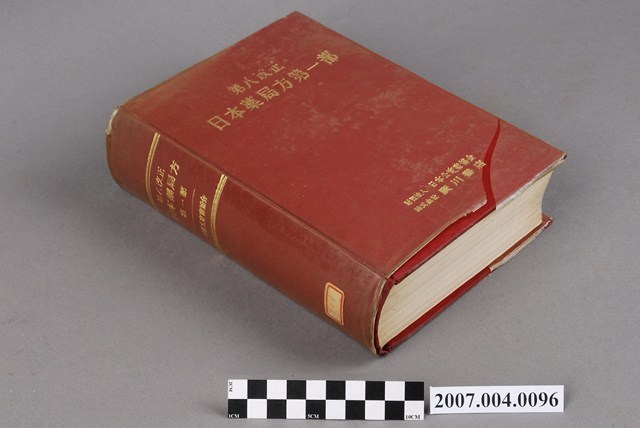 本物件為日本公定書協會編《第八改正日本藥局方第一部》。書皮為紅色硬殼,外層有塑膠書套。封面印有第八改正日本藥局方第一部、財團法人日本公定書協會、株式會社廣川書店字樣。目次頁前有厚生省告示第73號。目錄為日本藥局方沿革略記、まえがき、通則、生藥總則、製劑總則、醫藥品各條、一般試驗法、國際原子量表、日本名索引、ラテソ名索引。本書由株式會社廣川書店,於昭和46年(1971)5月10日發行,在臺灣由國興出版社發行。