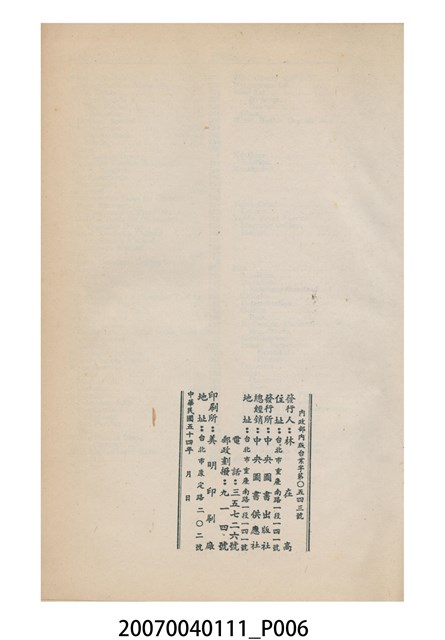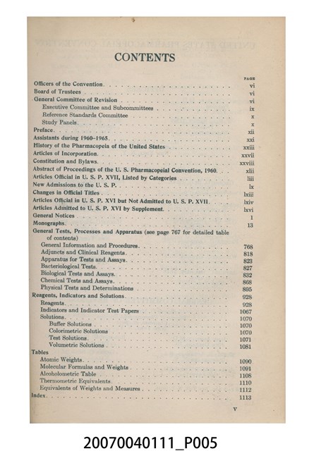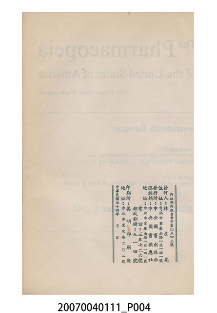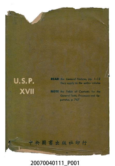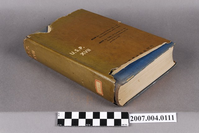 本物件為The Pharmacopeia of the United States of America1965年第17次修訂版,為墨綠色書皮。由物件正面可見「U.S.P. XVII」、「中央圖書出版社印行」字樣。其目錄章節可見包括「Officers of the Convention」、「Preface」。該刊物內頁亦可見刊物發行人為林在高,發行所為中央圖書出版社(地址為臺北市重慶南路一段一四一號)。