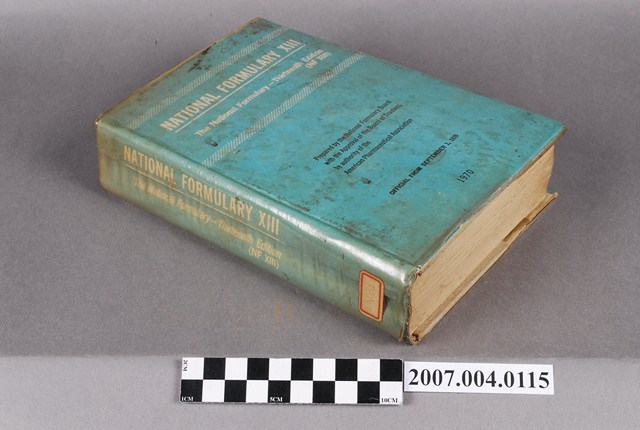 本物件為American Pharmaceutical Association出版《National Formulary》1970年第13版。書皮為淡藍綠色硬殼,外層有一塑膠書套。封面有National Formulary XIII、The National Formulary- Thirteenth Edition(N.F.XIII)、Prepared by the National Formulary Board with the Approval of the Board of Trustees, by authority of the American Pharmaceutical Association、OFFICIAL FROM SEPTEMBER 1, 1970、1970字樣,無圖。主要目錄為General Principles of Revision、General Notices、Monographs on Drugs, Chemicals, and Preparations、General Tests, Processes and Apparatus、Reagents and Test Solutions、General Information、Index。本書在臺灣是由國興出版社,於民國59年(1970)出版。書內夾有一張卡片,收信者為許敏娟。
