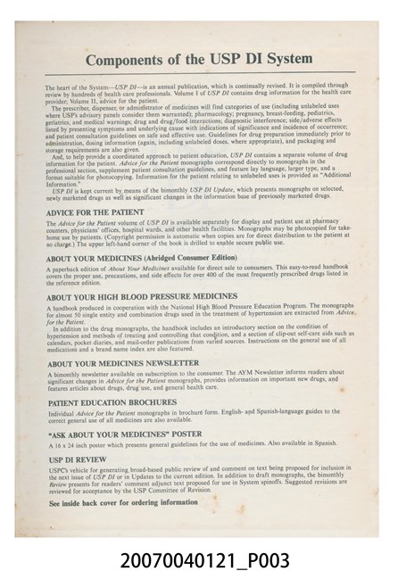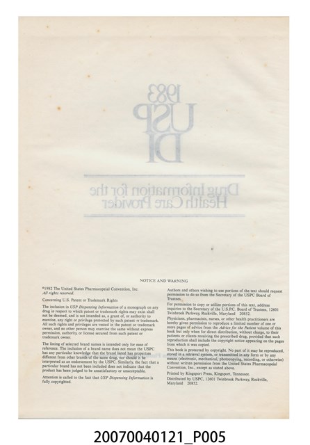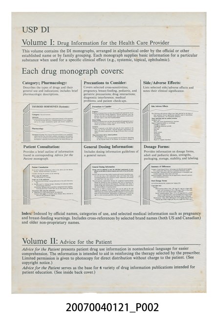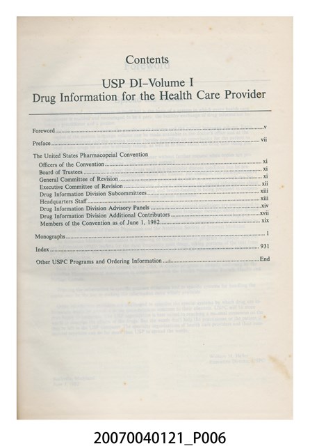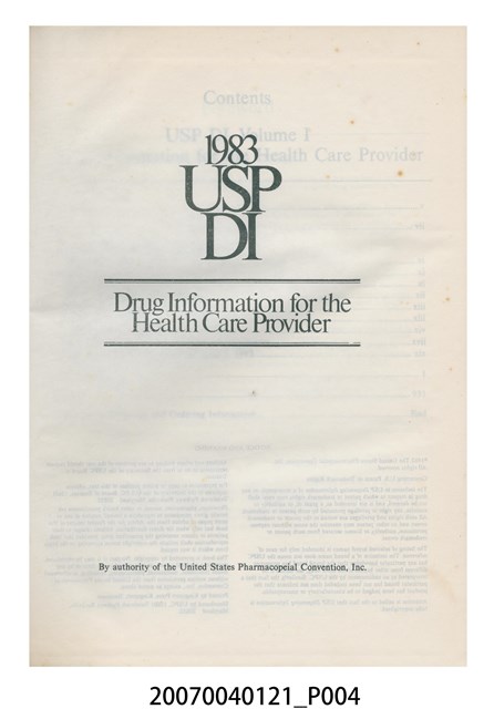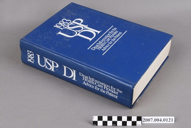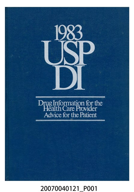 本物件為USP DI 1983年版,為藍色書皮。由物件正面可見「USP DI」、「Drug Information for the Health Care Provider」、「Advice for the Patient」字樣。其目錄章節可見包括「The United States Pharmacopeial Convention」(如:Officers of the Convention)、「Foreword」、「Preface」。