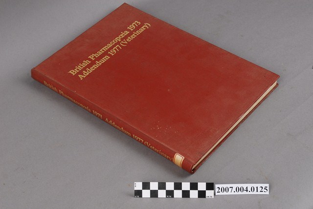 本物件為Medicines Commission出版《British Pharmacopoeia 1973 Addendum 1977(Veterinary)》。書皮為紅色硬殼。封面有British Pharmacopoeia 1973、Addendum 1977(Veterinary)字樣,無圖。主要目錄為General Notices、Monographs、Contents of the Appendices、Index。本書在臺灣是由國興出版社,於民國66年(1977)出版。