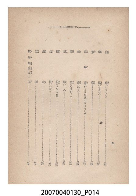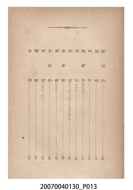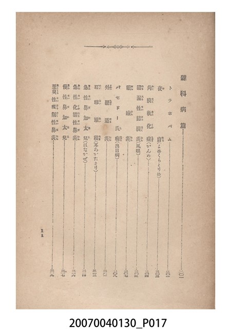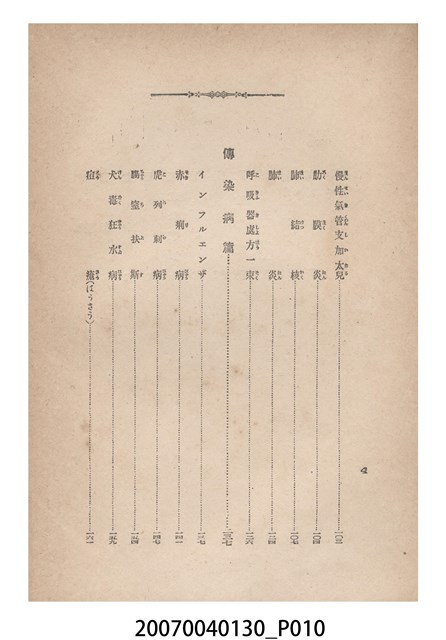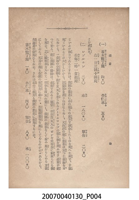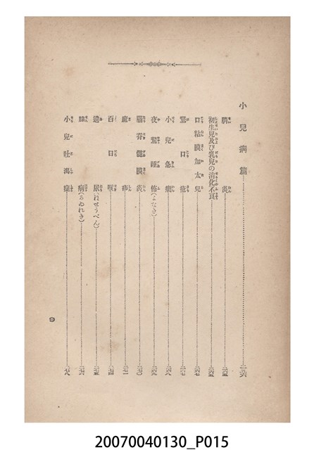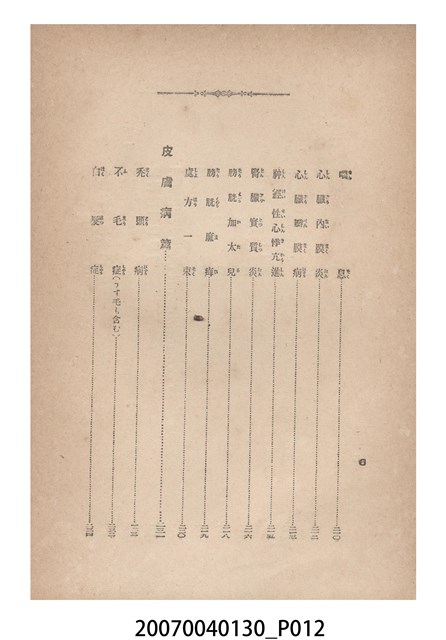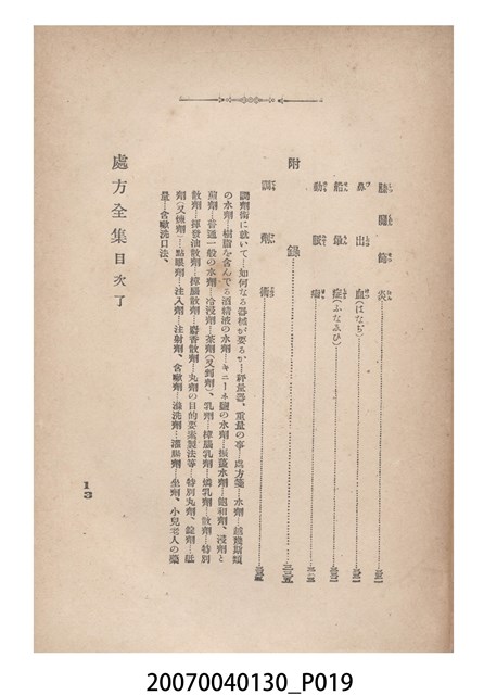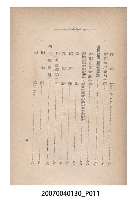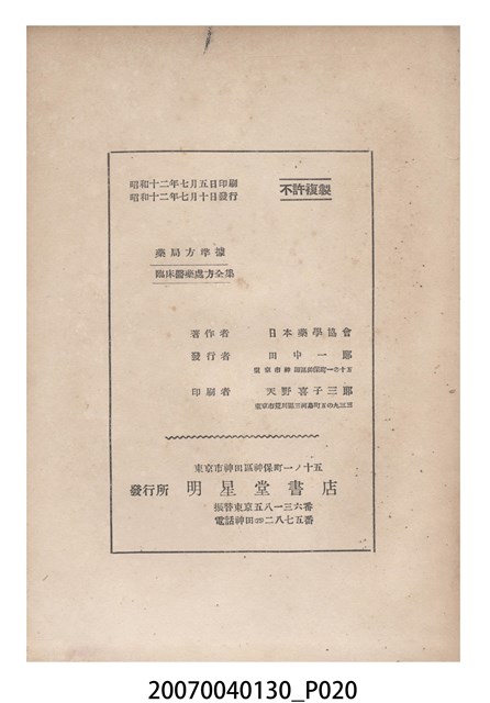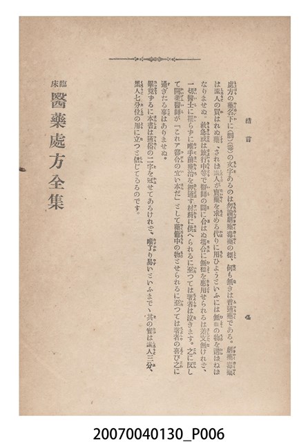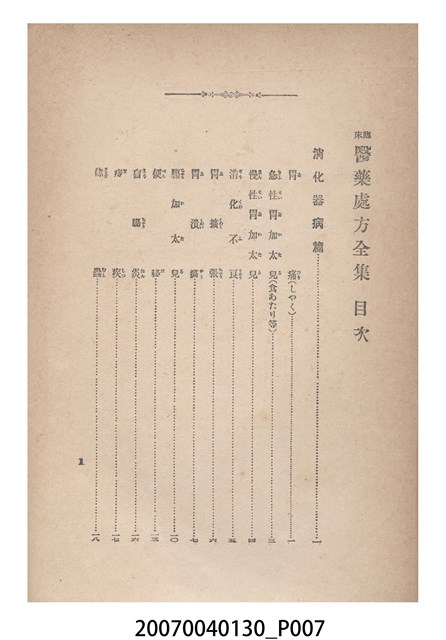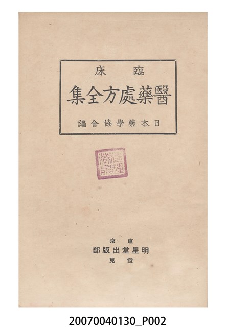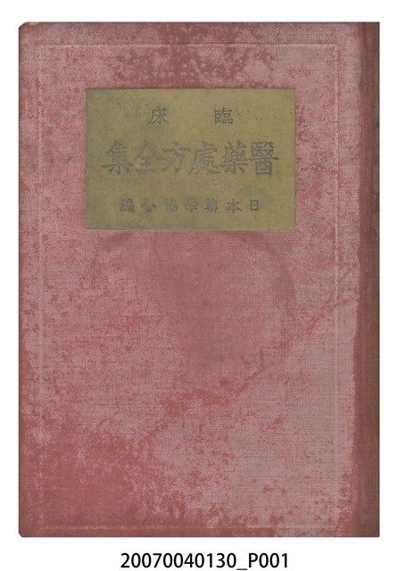 本物件為日本藥學協會編《臨床醫藥處方全集》。封面為紅底,物件正面可見黃框及書名「臨床醫藥處方全集 日本藥學協會編」。目錄依照病症種類分成10章,包括「消化器病篇」、「神系經病篇」、「呼吸器病篇」、「傳染病篇」「運動器病及體質病篇」、「內科雜病篇」、「皮膚病篇」、「小兒病篇」、「生殖病篇」、「雜科病篇」等。內頁可見本書由東京明星堂書店出版。