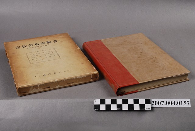 本物件為分析化學研究會編著《定性分析實驗書》。外封為紅色與棕色相間,封底印有「廣川書局」字樣。書本外有書殼。書殼封面印有「定性分析實驗書」、「分析化學研究會編著」與分擔執筆者姓名;下方有「東京 廣川書局 發行」字樣。書殼封底則有「廣川書局商標圖示」與「定價¥700 —」。內容包含緒論、一般基本操作、陽イオソ各個實驗、陽イオソ定性分析、陰イオソ各個實驗、陰イオソ定性分析、ペーバークロマトグラフィー、微量定性分析等。