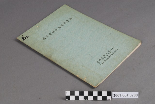本物件為行政院衛生署員工消費合作社印行《藥品查驗登記審查準則》。書皮為綠色。封面印有藥品查驗登記審查準則、行政院衛生署員工消費合作社印行、中華民國六十五年十月二十日字樣。目錄共有28個標題,無章節之分,標題例有鹽酸麻黃素等藥品之成人一日最大配合量、甲狀腺製劑基準、中藥濃縮製劑基準等。本書無正式出版資訊。