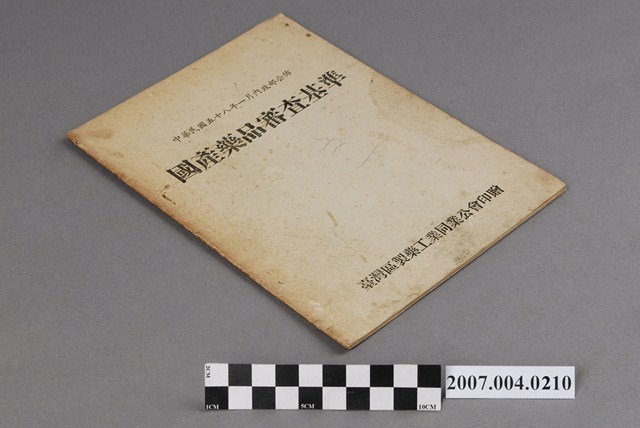 本物件為國產藥品審查基準,由物件正面可見「國產藥品審查基準」、「臺灣區製藥工業同業公會印贈」、「中華民國五十八年一月內政部公佈」字樣。其目錄章節可見包括「各種藥品之配合量」、「鎮暈劑基準」、「禁藥」、「節食藥品類之處理」。該刊物封面亦可見刊物發行所為臺灣區製藥工業同業公會(地址為臺北市敦化南路九三三號五樓)。