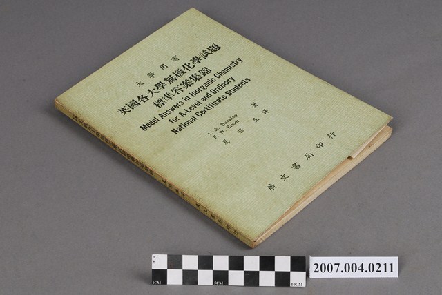 本物件為英國各大學無機化學試題標準答案集錦,為墨綠色書皮。由物件正面可見「英國各大學無機化學試題標準答案集錦」、「大學用書」、「廣文書局印行」字樣。該刊物內頁亦可見刊物發行人為王道榮,發行所為廣文書局有限公司(地址為臺北市羅斯福路二段九號之三)。由J. A. Buckley及F. M. Elmer共同著作,夏滌生翻譯,扉頁上並有一「聖異軒存」的紅色方形戳章。內容包括第一族至第七族、過渡元素、氧化和還原、配製、計算、其他、補充問題、課程要點以及已往試卷等章節。