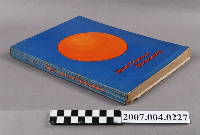 本物件為Albert L. Lehninger著《生物化學》。外封為藍色,封面印有橘色圓形圖示,下方則印有書名「Short Course in Biochemistry」,本書為臺灣經銷,內容有Water、Amino Acids and Peptides、Proteins、Enzymes、Carbohydrates等,一共23個章節。