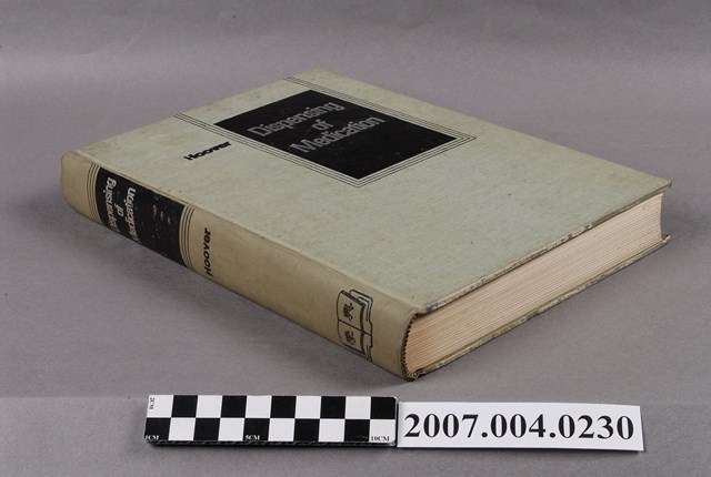 本物件為John E. Hoover編《Dispensing of Medication》第8版。書皮為硬殼。封面印有Dispensing of Medication、Hoover字樣。封面翻開有手寫之中國醫藥學院許敏珠1977字樣。目錄分為13個標題,Medication Orders、Bioavailability、Capsules、Powders、Tablets and Pills、Dermatologicals、Suppositories、Liquid Medications、EENT Medications、Parenteral Medications、Aerosols、Radiopharmaceuticals、Compounding and Dispensing Information。本書在臺灣是由興學出版社,於民國65年(1976)發行。