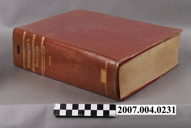 本物件為John E. Hoover等編《Remington's Pharmaceutical Sciences》第14版。書皮為紅色硬殼。封面無字無圖,僅書背有Remington's Pharmaceutical Sciences、fourteenth edition、1975字樣。目錄分為10個標題,例有Orientation、Pharmaceutlcs、Pharmaceutlcal Chemistry、Radioisotopes in Pharmacy and Medicine、Testing and Analysis、Pharmaceutlcal and Medicinal Agents、Biological Products、Pharmaceutlcal Preparetions and Their Manufacture、Pharmaceutlcal Practice、Appendix。本書在臺灣是由灨寧圖書出版社,於民國65年(1976)2月1日發行。