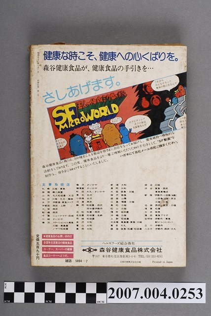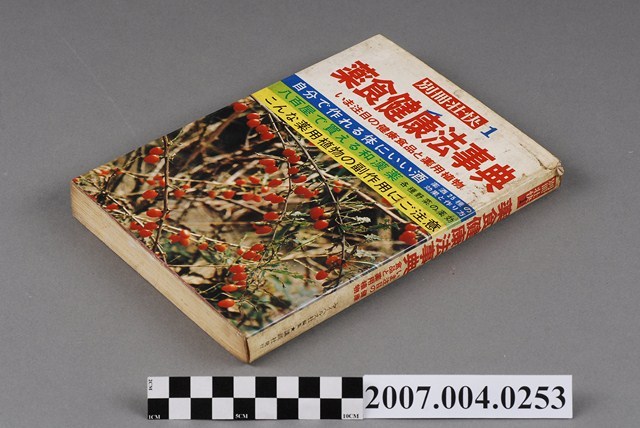 本物件為マイヘルス社編《藥食健康法事典》壯快別冊第1號。封面上方印有「壯快別冊1」、「藥食健康法事典」、「いま注目の健康食品と藥用植物」,並對書本內容簡介,如「25種藥酒的效果和製作方法」、「各種蔬菜的藥效」、「藥用植物的副作用」等。封底印有「森谷健康食品株式會社」字樣、標語、漫畫插圖等。