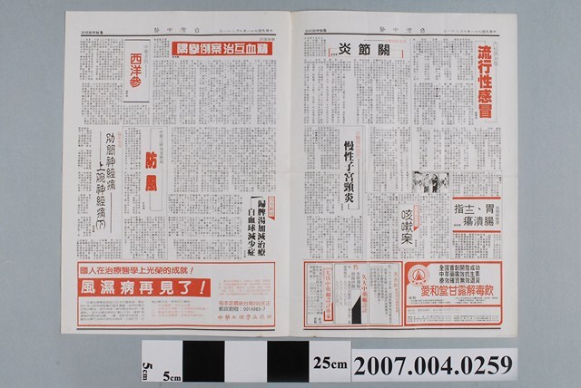 本物件為台灣中醫新聞通訊社出版《台灣中醫》民國78年7月21日第5期。此物件為1大張,共有4版,第1版有刊物標頭台灣中醫以及發行訂閱資訊,此刊物原為中國醫藥資訊周刊第29期。第1版新聞通訊版頭條為指紋圖譜辨識中藥真偽,另有其他新聞。第2版醫學臨床版頭條為流行性感冒,另有其他醫藥資訊和廣告。第3版醫學基礎版頭條為精血互治案例舉隅,另有其他醫藥資訊和廣告。第4版考訊報導版頭條為中草藥炮製法3,另有中醫師特考試題分析與廣告。