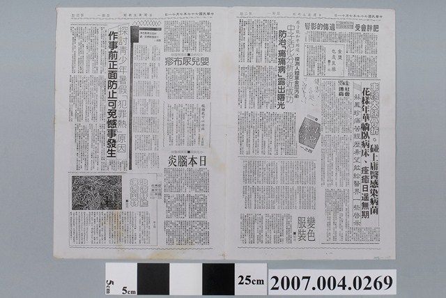 1. 本物件為台灣衛生新聞社發行《台灣衛生新聞》民國77年7月11日第1883期。此物件共有4版,第1版有刊物標頭台灣衛生新聞以及發行訂閱資訊。第1版頭條為文化城206家牙醫診所僅54家有勞保,另外還有其他新聞。第2版頭條為肥胖會受遺傳的影響,另有其他資訊,例有變色服裝。第3版頭條為嬰兒尿布疹,另有其他資訊,例如探討青少年暑假犯罪熱原因。第4版頭條為慎防冷氣病,另有其他健康衛生資訊。
